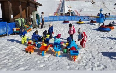 con una piccola struttura protetta ed attrezzata con palette, secchielli e vari giochi da fare con la neve, tavolini con pennarelli per disegnare e una giostrina con gommoni dove salire/scendere tutte le volte che si vuole!!!